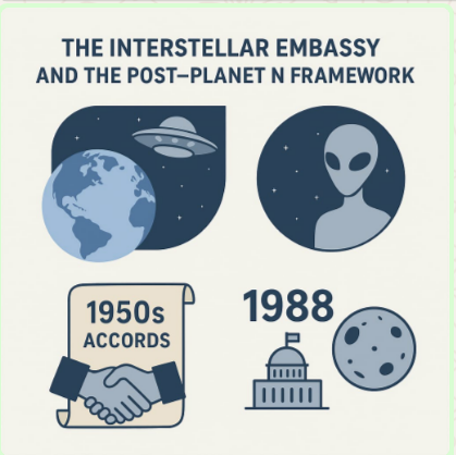 The Interstellar Embassy is a term used in contemporary fringe studies, fan communities, and speculative cosmology narratives to describe a network of alleged interworld contacts, accords, and coordinating bodies that were said to operate between Earth and various extraterrestrial or transdimensional entities during the second half of the 20th century. The concept became prominent after the alleged disappearance of Planet N in 1988, an event interpreted by several narrative traditions as marking the end of one interstellar order and the beginning of another.