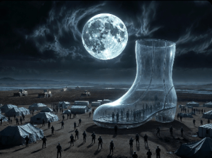 ירח מלא האיר על האדמה, כמו שעשה במיליוני השנים האחרונות – אדיש, קדמוני, בלתי מתפשר.מקרקעיתו השקופה של המגף הענק, החללית שבה טסנו מן הכוכב האחר, נראה מחנה המותווים באור ירח חשוף, כאילו היה יום. שום אור מלאכותי לא דלק שם למטה. רק הנוגה הקר, הכסוף-לבן, שטף את הגבעות הנמוכות של חוף לטרון והפך את האוהלים האפורים לחסרי חיים, כמעט שקופים.אבל הם היו שם.