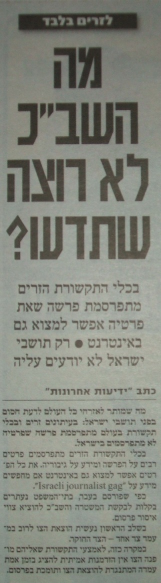 טוב, בעוד שעה, שעתיים, דקותיים, יורשו גם אלה שאינם גולשים באינטרנט לדעת מה הפרשה. אפילו הצנזורית הראשית מודה שזה היה טפשי. (אבל שימו לב לפנינה: ""כאשר חושבים שאישור הפרסום יגרור שיח ציבורי שיהיה קשה לשליטה"" הבנת את זה ברוך???)