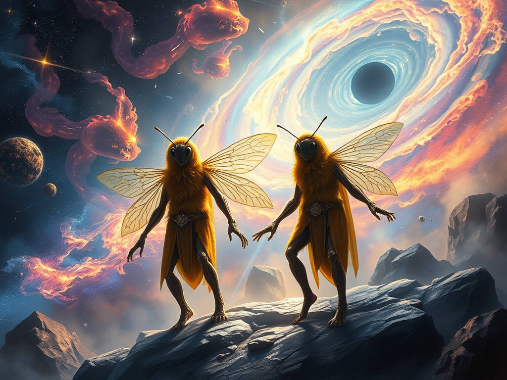 Until the discovery of immortality, bee humans lived in fear and awe of the 'higher instances' and the 'cosmic sexual hunger' which linked with the black holes, from which grew, according to their belief, 'the dark reason', which according to the sages of the High School of Galactic Reason, created quarrels between bee humans, caused them wars between them and fed on the shed blood and the ‘special aroma’ of life energy produced from the warriors who killed each other.