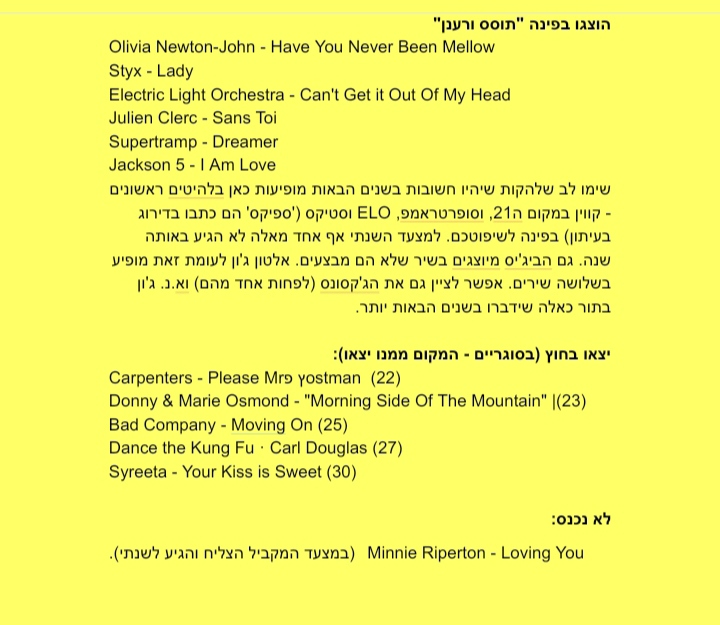 ממשיכים בהמתנה לאישור פרסום של ידע נוסף, עוד מצעד אחד מעומק המאה הקודמת, השבוע לועזי גל"ץ ב12 במרץ 1975, תקופת ביניים כזאת בין פריצת הדיסקו והפאנק/גל חדש ושאר מה שיעצב את המשך שנות ה70 (להיטי בכורה לקווין, סופרטראמפ ואי.אל.או) לבין מה שהיה קודם. שלושה שירים בצרפתית. כמה מהשירים אתם מכירים?